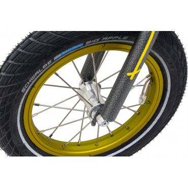 Die aufblasbaren 12-Zoll-Räder mit hochwertigen Schwalbe Big Apple-Reifen bieten ein Höchstmaß an Sicherheit. Diese Reifen sind mit reflektierenden Streifen versehen, um die Sichtbarkeit zu erhöhen und maximale Sicherheit zu gewährleisten. Mit einer Breite von 2 Zoll bieten sie den größtmöglichen Komfort und minimieren den Rollwiderstand. Die Shimano-Hinterradbremse mit Kinderbremshebel sorgt für sicheres Anhalten und einfaches Handling und trägt so zu einem insgesamt komfortablen und sicheren Fahrgefühl bei.
